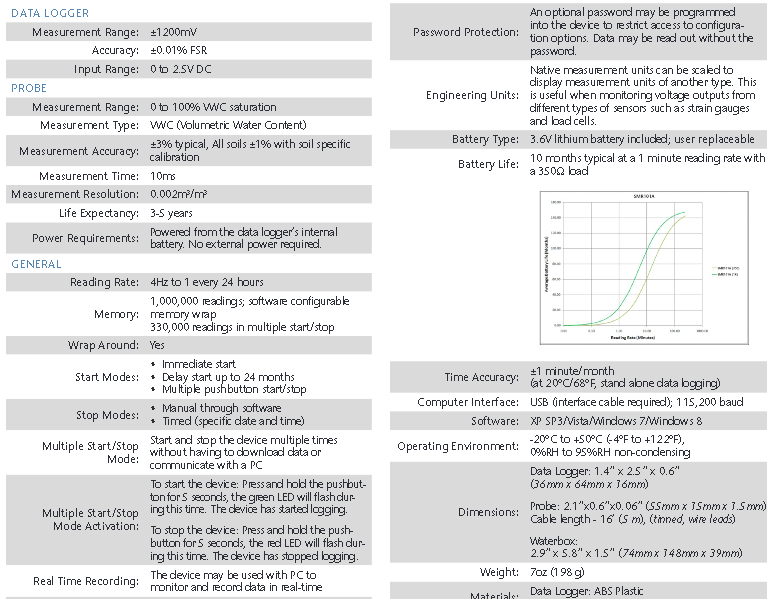 | Moisture Range | 0 %VWC to 100 %VWC saturation |