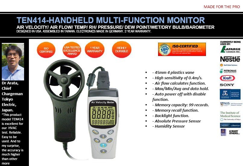 You are here: Home Products Airflow meters TEN414-MULTIFUNCTION ANEMOMETER/ AIRFLOW METER - VELOCITY/FLOW/ TEMP/RH/PRESSURE/DATALOG