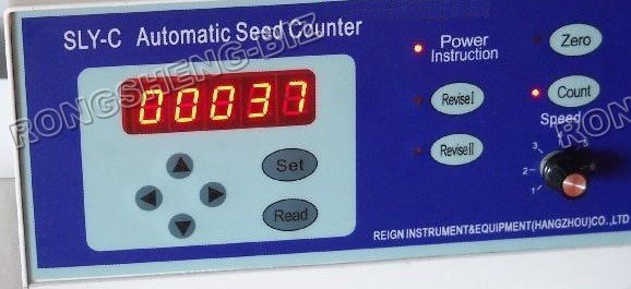 seeds are counted than have been preset. Counting speed may also be manually adjusted. The instrument can recognize when the receptacle or the feed container is absent, stops counting and reports the fact on the display