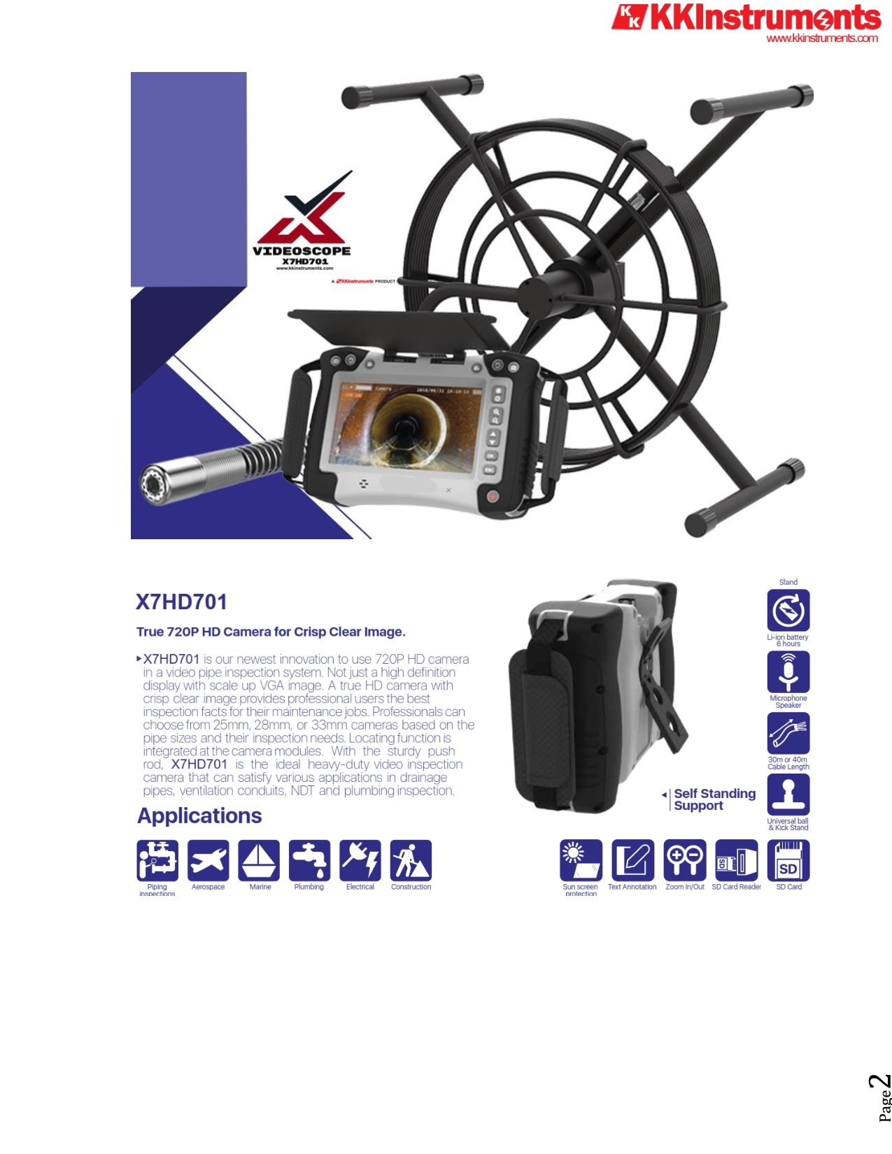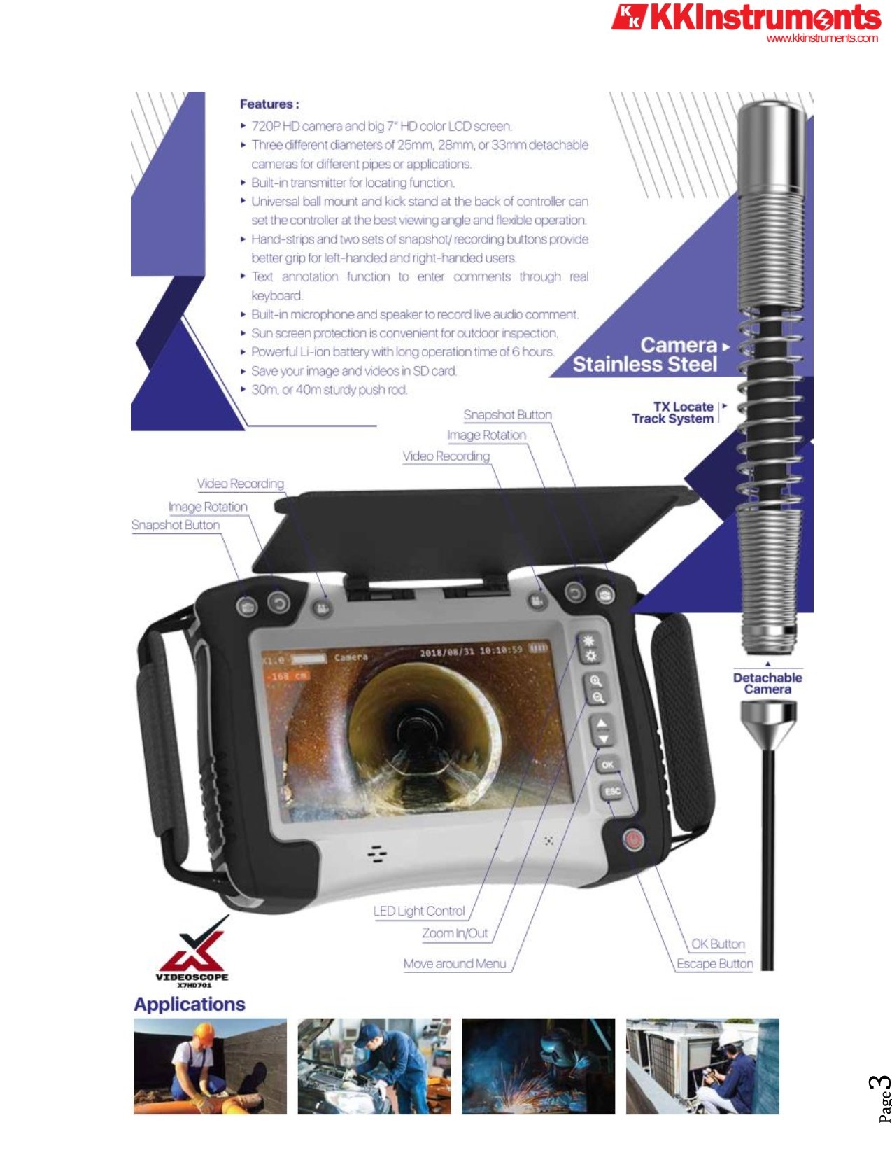 X7HD701 is our newest innovation to use 720p HD camera in a video pipe inspection system. Not just a high definition display with scale up VGA image, a true HD camera with crisp clear image provides professional users the best inspection facts for their maintenance jobs. Professionals can choose from 25mm, 28mm, or 33mm cameras based on the pipe sizes and their inspection needs. Locating function is integrated at the camera modules.