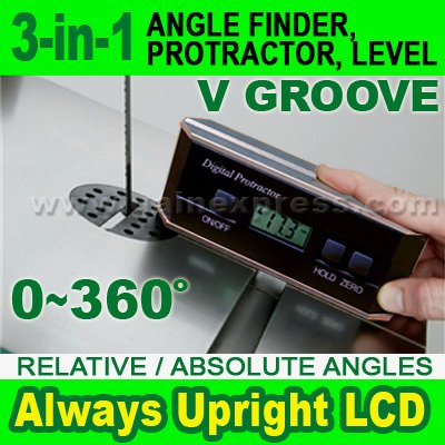 A revolutionary 3-in-1 digital protractor uses angle sensor technology to calculate exact angles simply by tilting it to the desired angle! Measurements are generated by a electronic gravity sensor to provide unsurpassed accuracy throughout the protractor's 360° (4 x 90°) range. If using upside down the display will automatically rotate so it always remains upright for easy reading, while simple self calibration requires no other fixtures. With high resolution & accuracy, providing unparalleled accuracy and stability. With v-groove ensures it sits flat against any surface or round objects such as pipes, shafts or rods and powerful magnets on bottom plate for secured attachment.