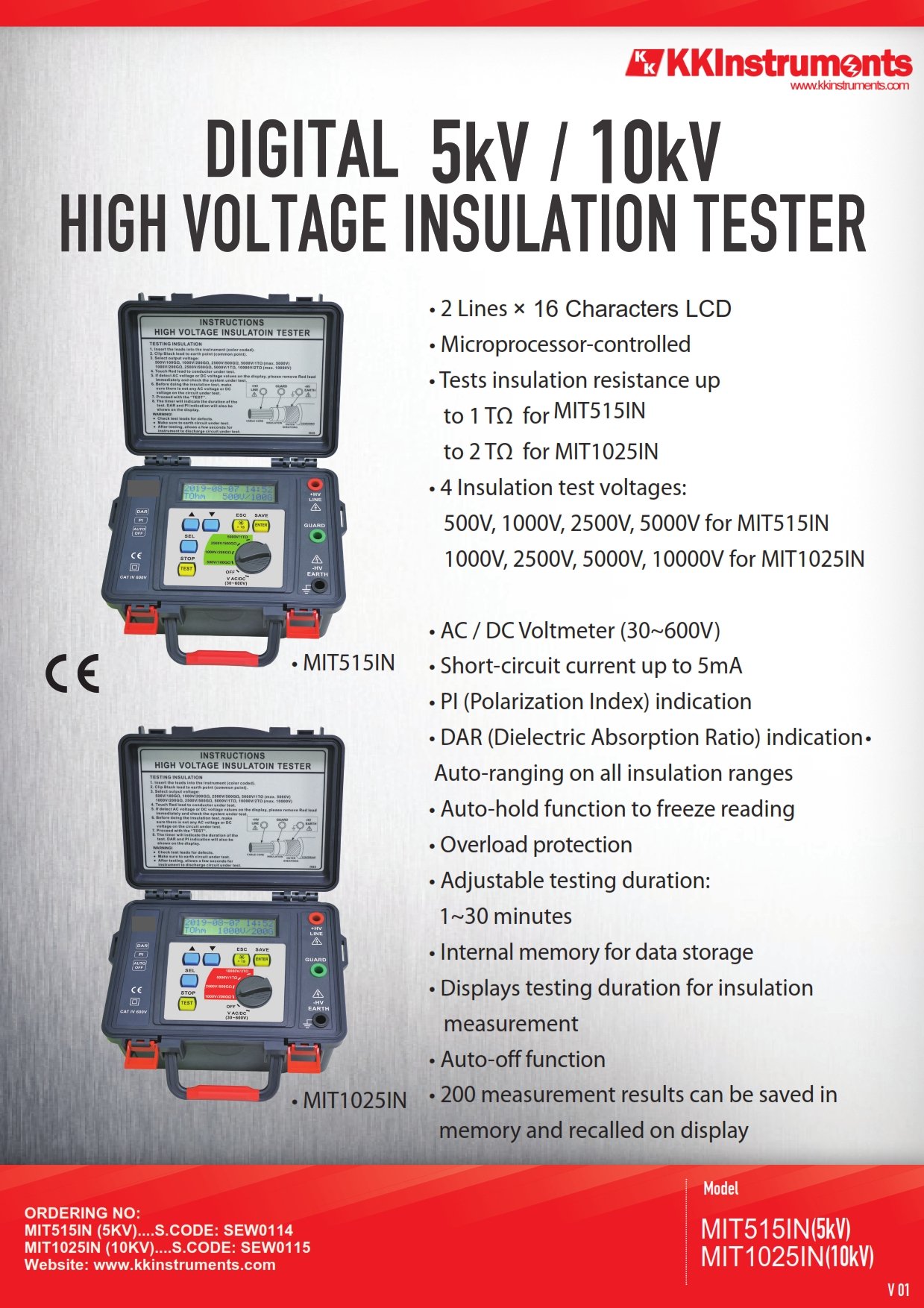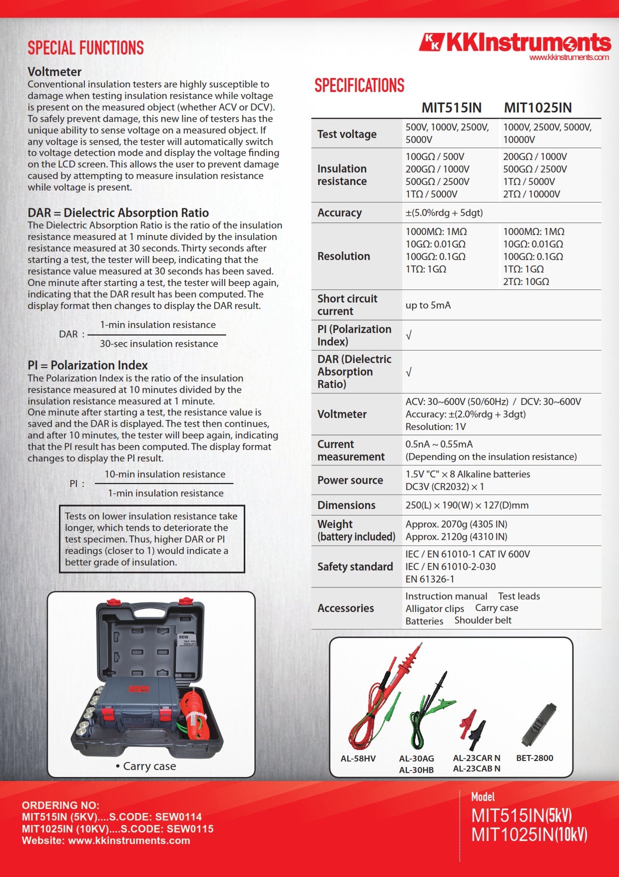 • 2 Lines × 16 Characters LCD • Microprocessor-controlled • Tests insulation resistance up to 1 TΩ • 4 Insulation test voltages: 500V, 1000V, 2500V, 5000V • AC / DC Voltmeter (30~600V) • Short-circuit current up to 5mA • PI (Polarization Index) indication • DAR (Dielectric Absorption Ratio) indication • Auto-ranging on all insulation ranges • Auto-hold function to freeze reading • Overload protection • Adjustable testing duration: 1~30 minutes • Internal memory for data storage • Displays testing duration for insulation measurement • Auto-off function • 200 measurement results can be saved in memory and recalled on display