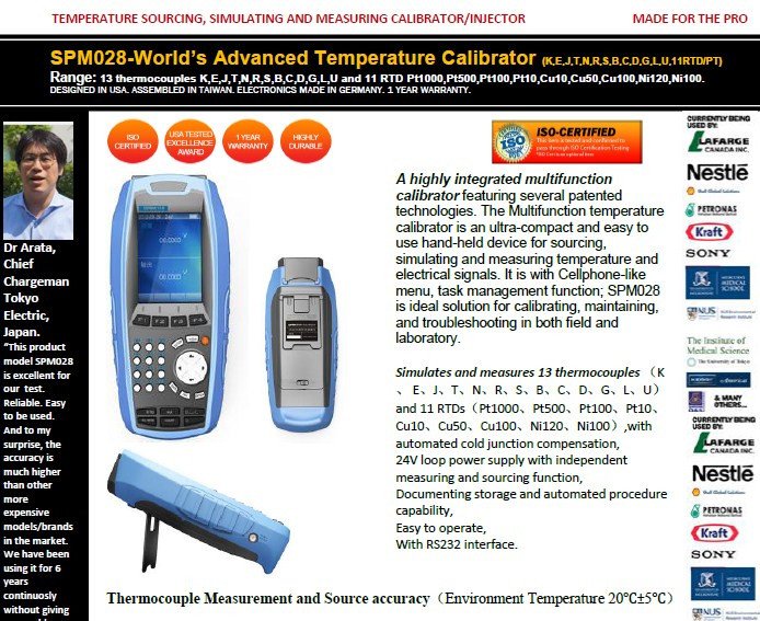 A highly integrated multifunction calibrator featuring several patented technologies. The Multifunction temperature calibrator is an ultra-compact and easy to use hand-held device for sourcing, simulating and measuring temperature and electrical signals. It is with Cellphone-like menu, task management function; SPM028 is ideal solution for calibrating, maintaining, and troubleshooting in both field and laboratory.